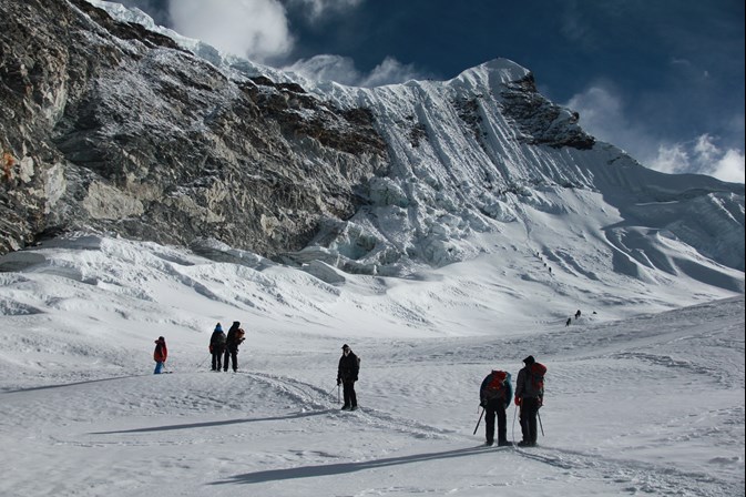Another easy day brings you to the narrow base camp below the south ridge of Island Peak. (C,B,L,D)